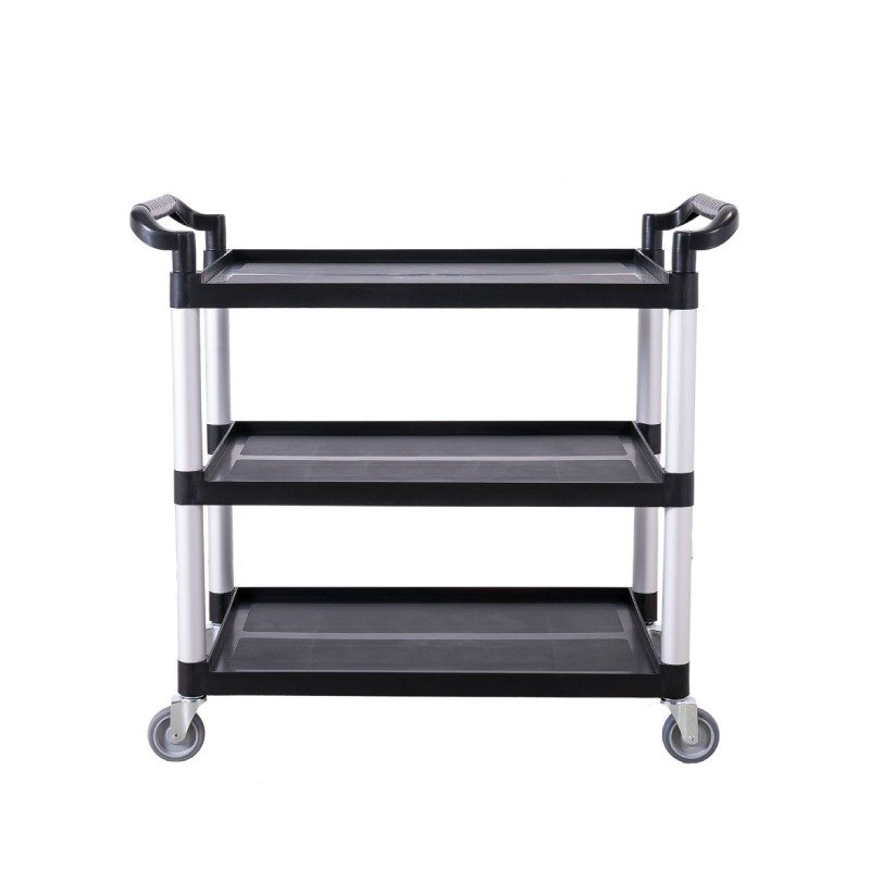 - طاولة خدمة سوداء توفر لمسة جمالية للمكان الموجودة به وبها 3 أرفف لحمل الكثر من المنتجات.