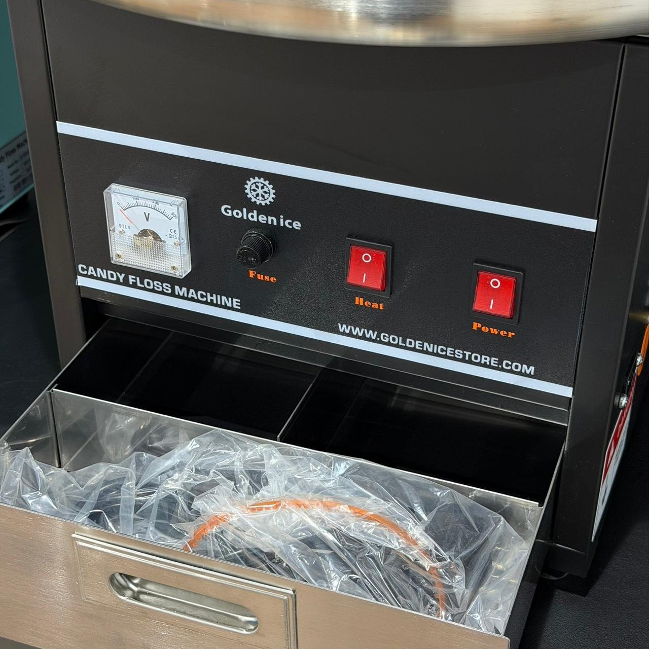 - تحتوي الماكينة على حلة للتحضير سعتها كبيرة لتصنع الكثير من أحجام حلوى الغزل.
