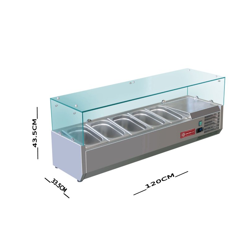 ثلاجات السلطة من المعدات الأساسية في أي مطعم أو مشروع فود ترك حيث يتم فيها حفظ السلطات وعرضها للعملاء، ولهذا نقدم ثلاجة سلطات 120 والمصنوعة بالكامل من المواد صديقة البيئة ولها قدرة على حفظ 5 أنواع من السلطة في آن واحد.